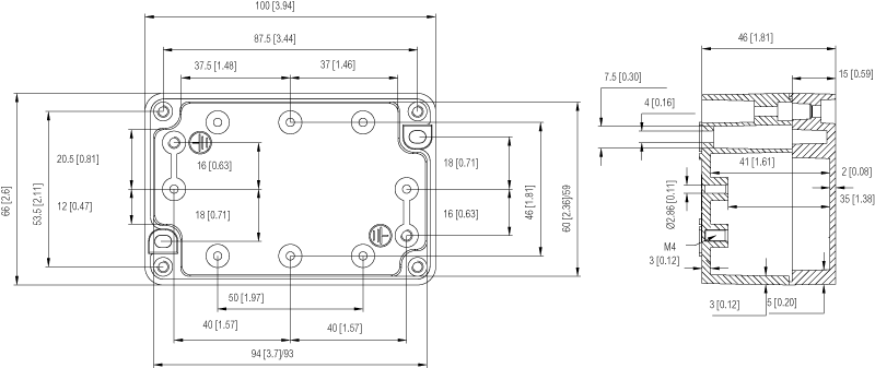 Indeholder : Kassebund med skruer til montageplade/DIN-skinne og dæksel med PUR pakning og dækselskruer af rustfri stål.