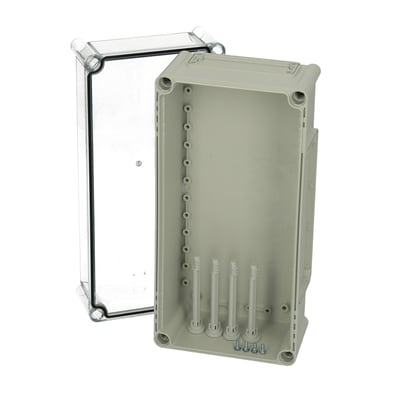 Kassebund med flangeblanketter, skruer til montageplade, dæksel med PUR pakning og med dækselskruer af polyamid