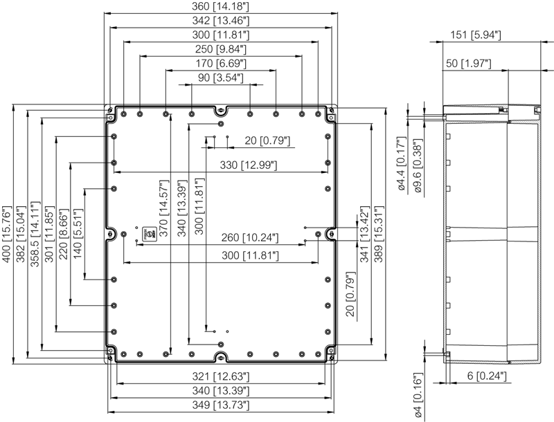 Indeholder : Kassebund med skruer til montageplade/DIN-skinne og dæksel med PUR pakning og dækselskruer af rustfri stål.