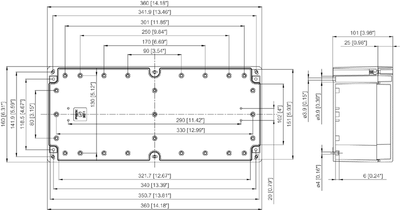 Indeholder : Kassebund med skruer til montageplade/DIN-skinne og dæksel med PUR pakning og dækselskruer af rustfri stål.