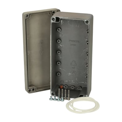 Bestehend aus : Base with screws for mounting plate/DIN-rail, cover, silicone gasket, stainless steel cover screws.