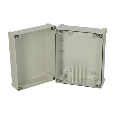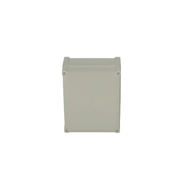 Alaosa PUR-tiivisteellä, ruuvit asennuslevylle/DIN-kiskolle, kansi polyamidi kansiruuveilla ja muoviset saranat.