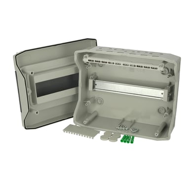 Comprend : DIN rail, Insulated terminals, neutral and earth, Cover for unused modules, Installation accessories, Plastic cap for screws
