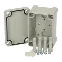 Base avec joint polyuréthane, vis de montage et couvercle avec vis en polyamide et charnières en plastique.