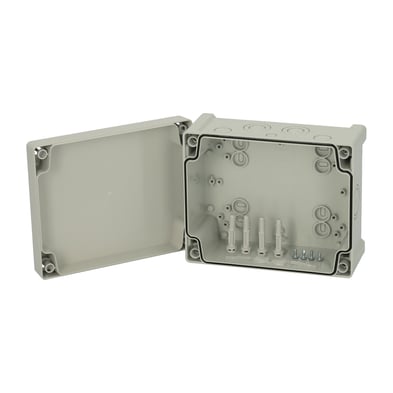 Base avec joint polyuréthane, vis de montage et couvercle avec vis en polyamide et charnières en plastique.