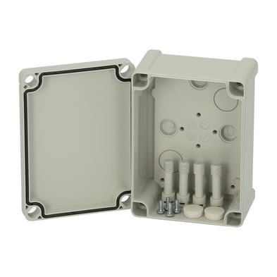 Base with PUR gasket and screws for mounting plate/DIN-rail. cover with polyamide cover screws and plastic hinges.