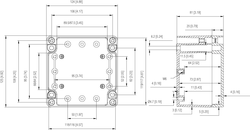 Zawiera : Podstawa ze srubami do plyty montazowej/szyny DIN, pokrywa uszczelka PUR i srubami ze stali nierdzewnej.