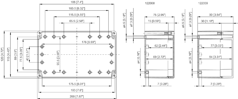 Zawiera : Podstawa ze srubami do plyty montazowej/szyny DIN, pokrywa uszczelka PUR i srubami ze stali nierdzewnej.