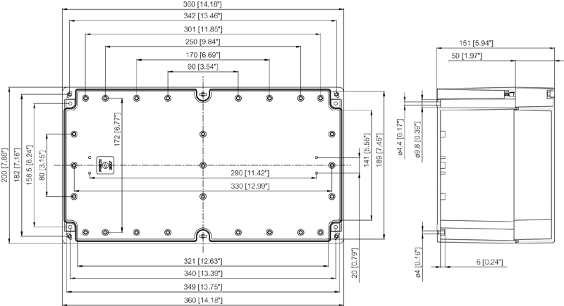 Podstawa ze srubami do plyty montazowej/szyny DIN, pokrywa uszczelka PUR i srubami ze stali nierdzewnej.
