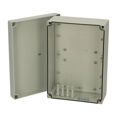 Podstawa z uszczelką PUR i śrubami do płyty montażowej/szyny DIN, pokrywa ze śrubami poliamidowymi.