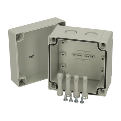 Podstawa z uszczelką PUR i śrubami do płyty montażowej/szyny DIN, pokrywa ze śrubami poliamidowymi.