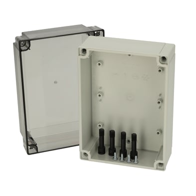 Base with TPE gasket. screws for mounting plate/DIN-rail and cover with polyamide cover screws.