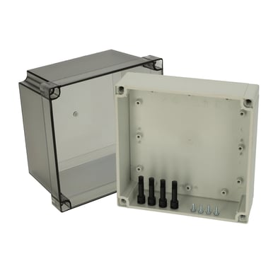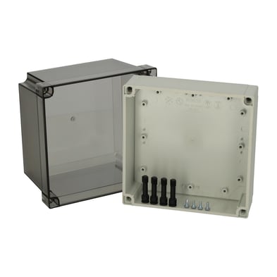 Base with TPE gasket. screws for mounting plate/DIN-rail and cover with polyamide cover screws.