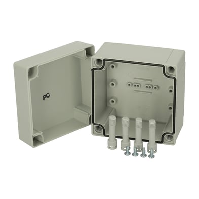 Base with PUR gasket. screws for mounting plate/DIN-rail and cover with polyamide cover screws.