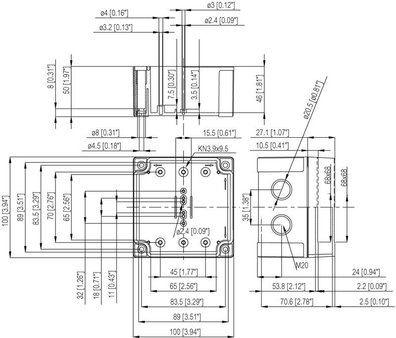 Base with PUR gasket. screws for mounting plate/DIN-rail and cover with polyamide cover screws.