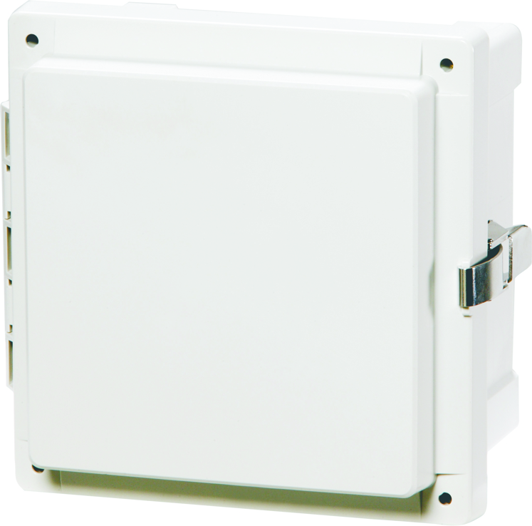 Hinged cover. Base with 10-32 brass inserts, latched cover with formed in place PUR gasket, stainless hinge pin. Quick release latches. Enclosure mounting foot kit. Accessory 10-32 screws for panel mounting.