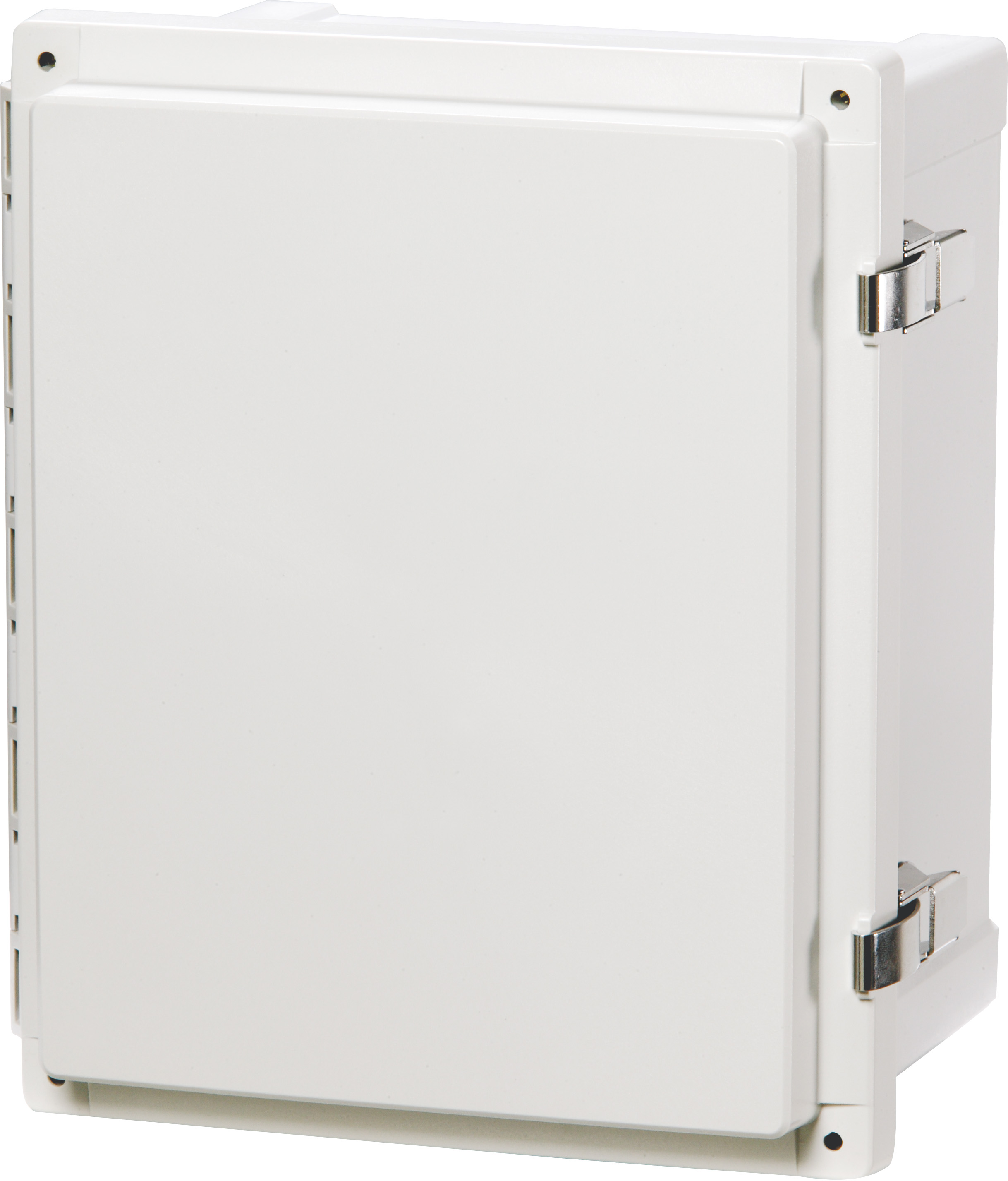 Hinged cover. Base with 10-32 brass inserts, latched cover with formed in place PUR gasket, stainless hinge pin. Quick release latches. Enclosure mounting foot kit. Accessory 10-32 screws for panel mounting.