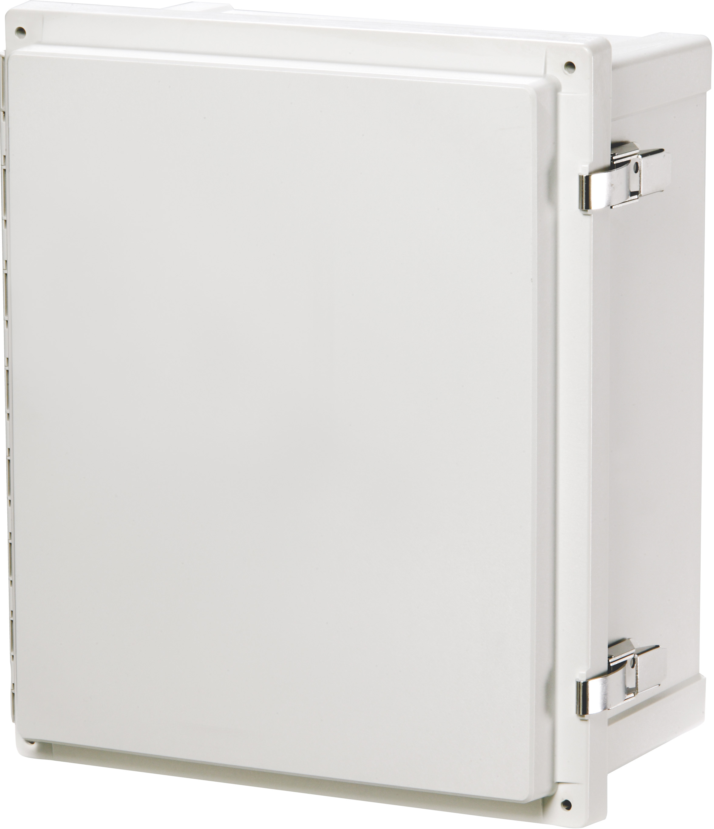 Hinged cover. Base with 10-32 brass inserts, latched cover with formed in place PUR gasket, stainless hinge pin. Quick release latches. Enclosure mounting foot kit. Accessory 10-32 screws for panel mounting.
