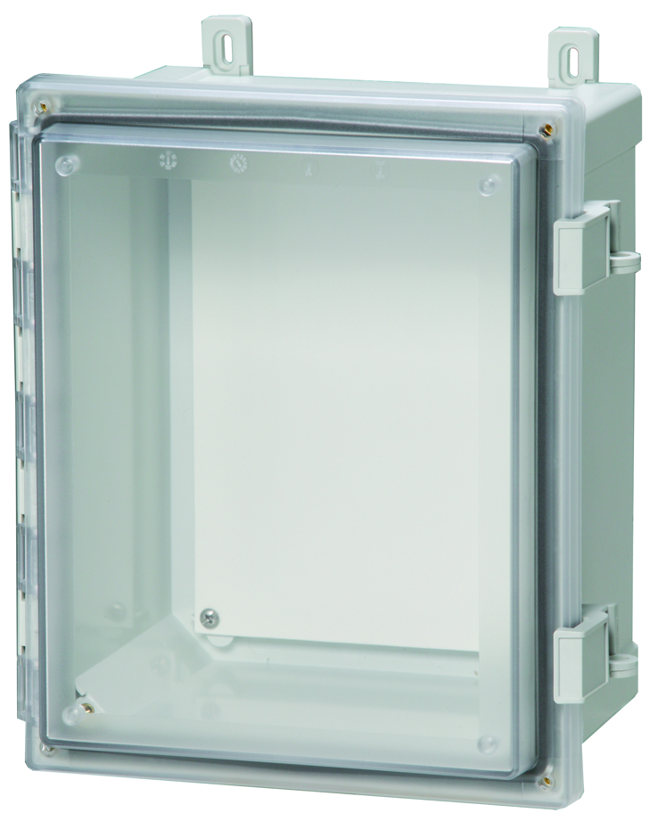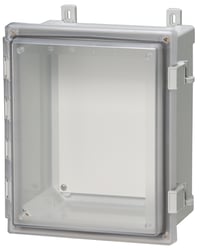 Hinged cover. Base with 10-32 brass inserts, latched cover with formed in place PUR gasket, stainless hinge pin. Quick release latches. Enclosure mounting foot kit. Accessory 10-32 screws for panel mounting.