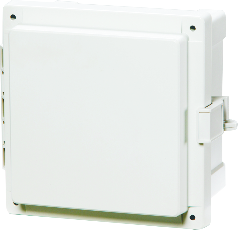Hinged cover. Base with 10-32 brass inserts, latched cover with formed in place PUR gasket, stainless hinge pin. Quick release latches. Enclosure mounting foot kit. Accessory 10-32 screws for panel mounting.