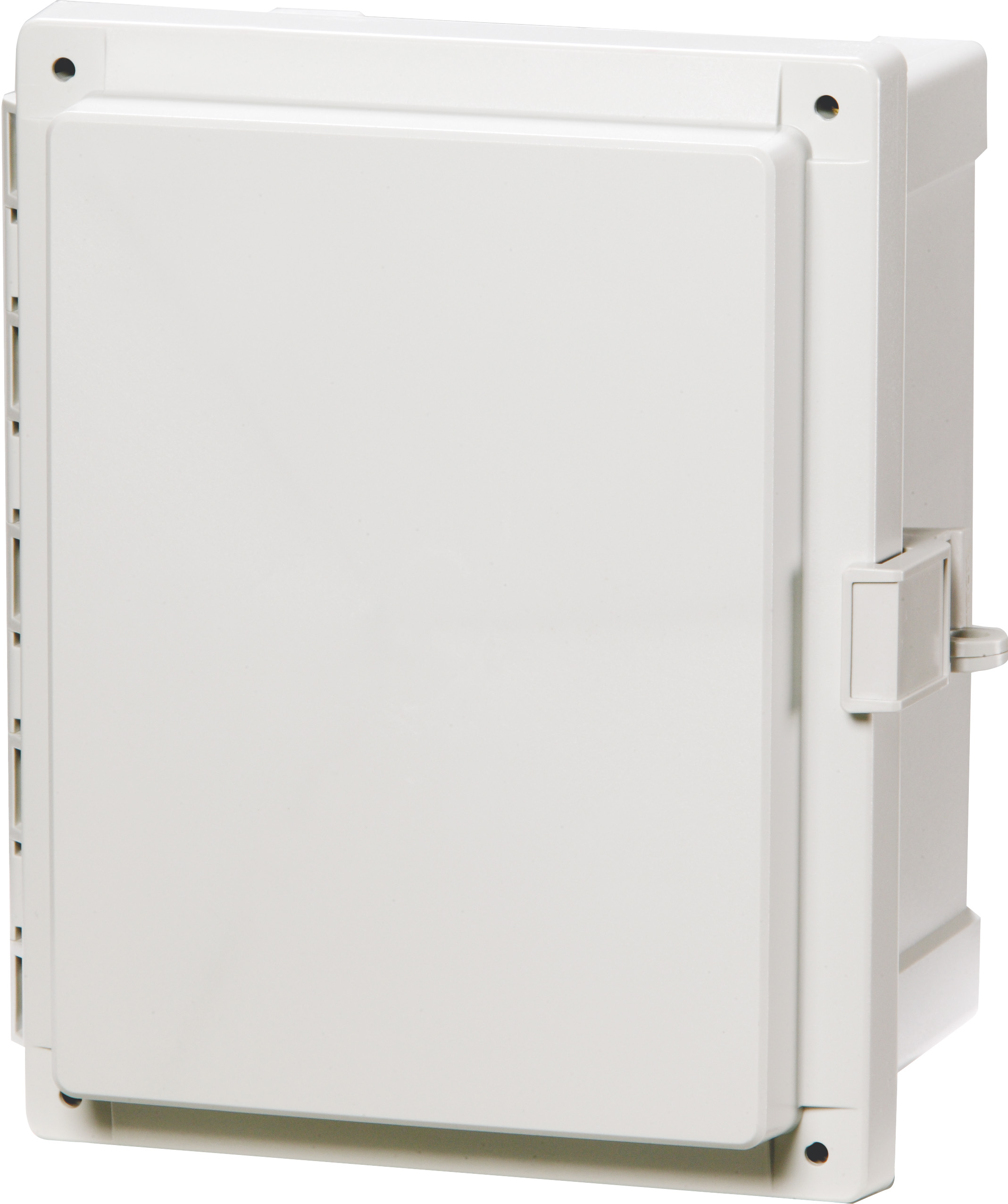 Hinged cover. Base with 10-32 brass inserts, latched cover with formed in place PUR gasket, stainless hinge pin. Quick release latches. Enclosure mounting foot kit. Accessory 10-32 screws for panel mounting.