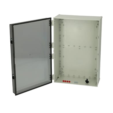 Cabinet base. door with PUR gasket. 3mm double bit lock(s) with key. screws for mounting plate/DIN-rail and corner plugs.