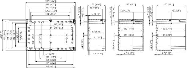 Including : Base with screws for mounting plate/DIN-rail. cover with PUR gasket and stainless steel cover screws.