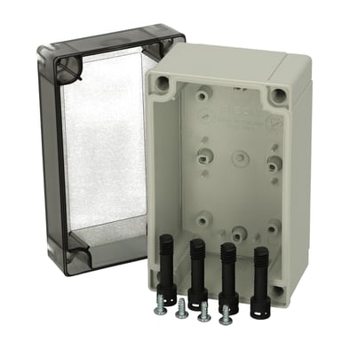 Base with TPE gasket. screws for mounting plate/DIN-rail and cover with polyamide cover screws.