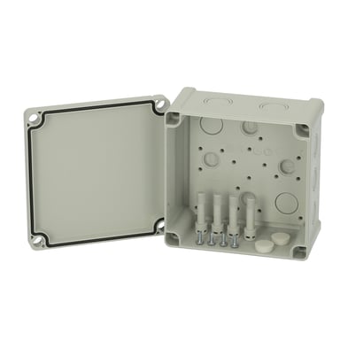 Underdel med PUR-packning, skruvar för montageplåt/DIN-skena, lock med lockskruvar i polyamid och plastgångjärn.